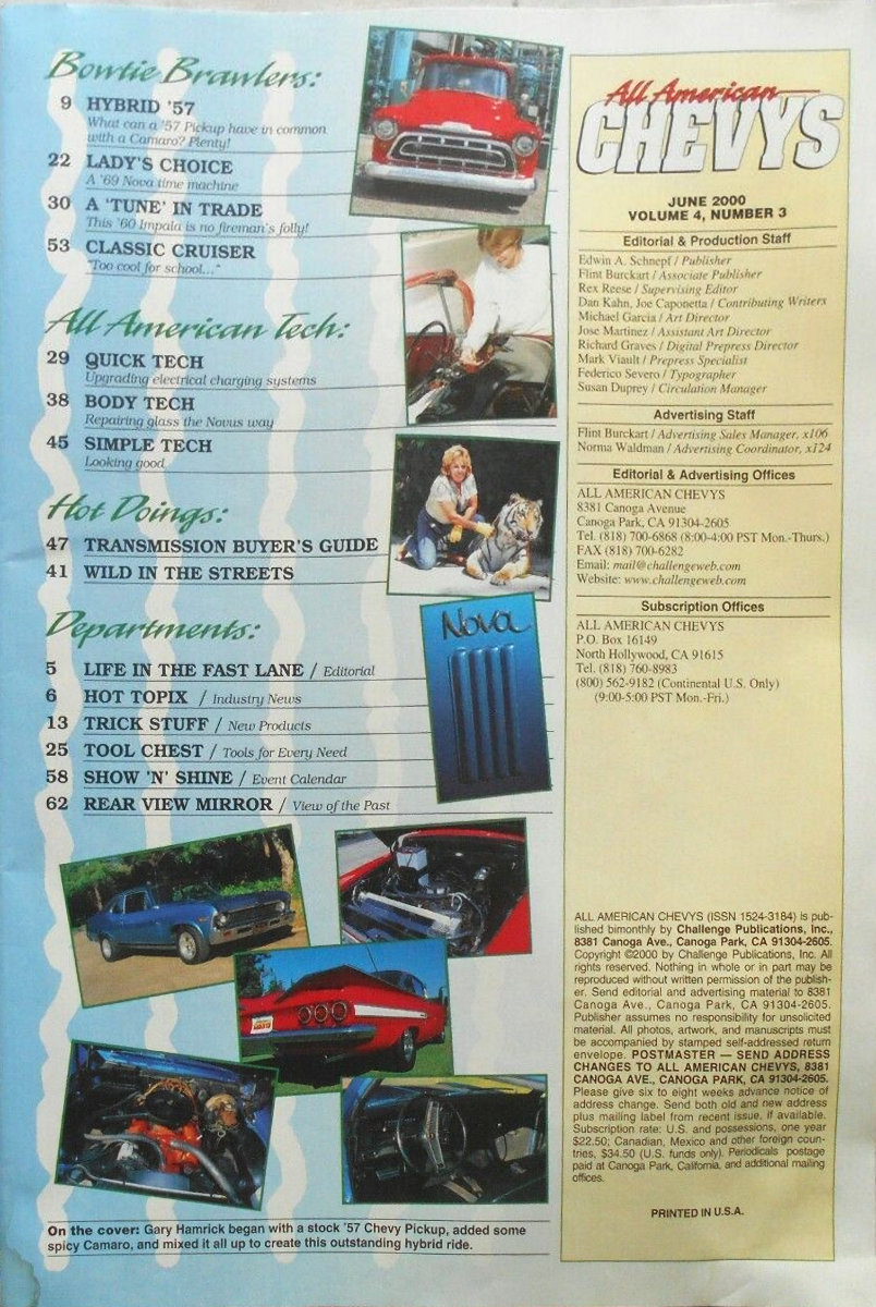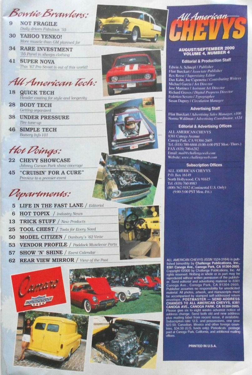 All American Chevys was published by Challenge Publications in Canoga Park, California. Content was focused on