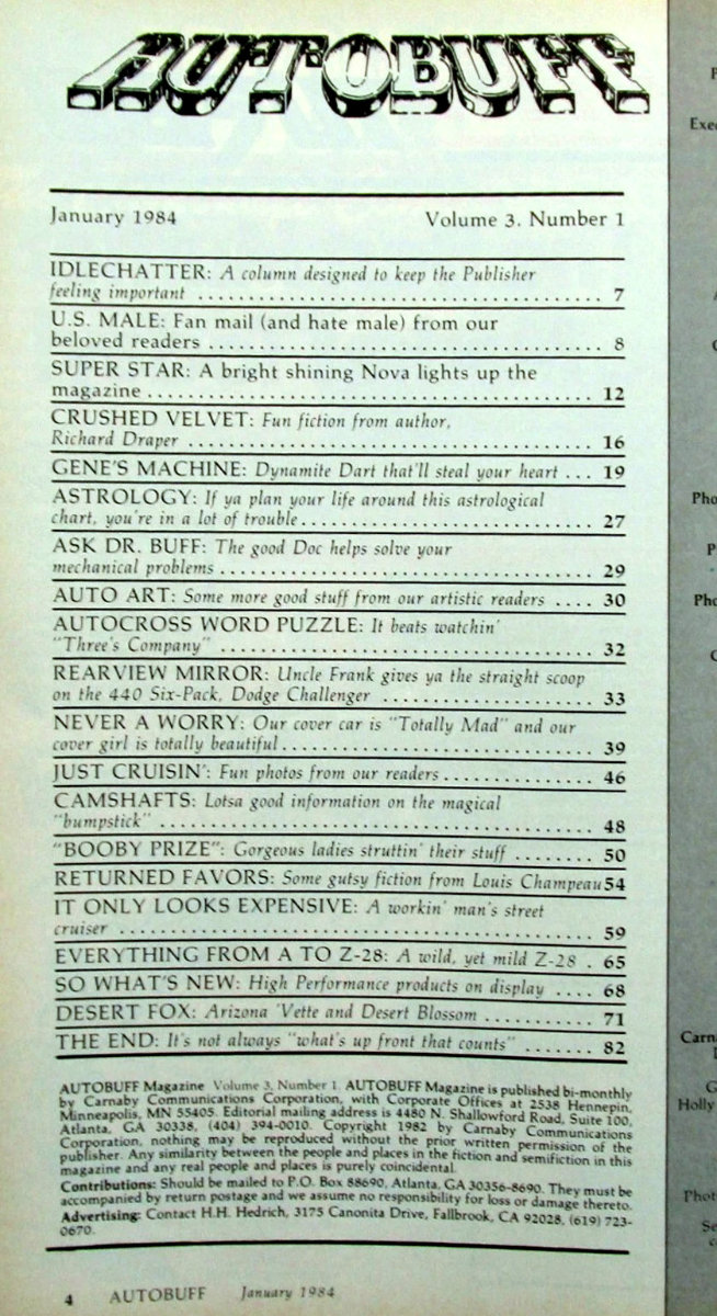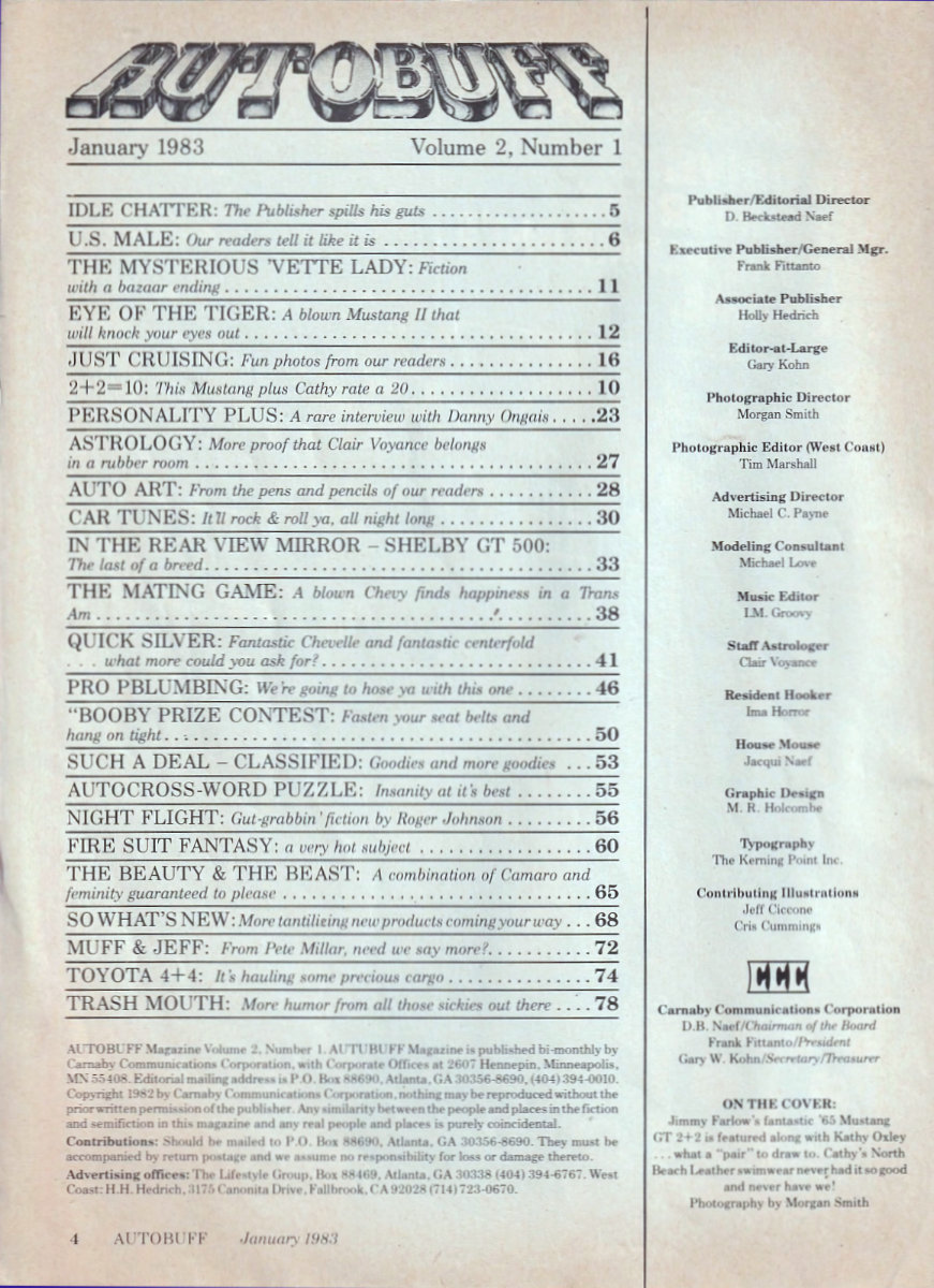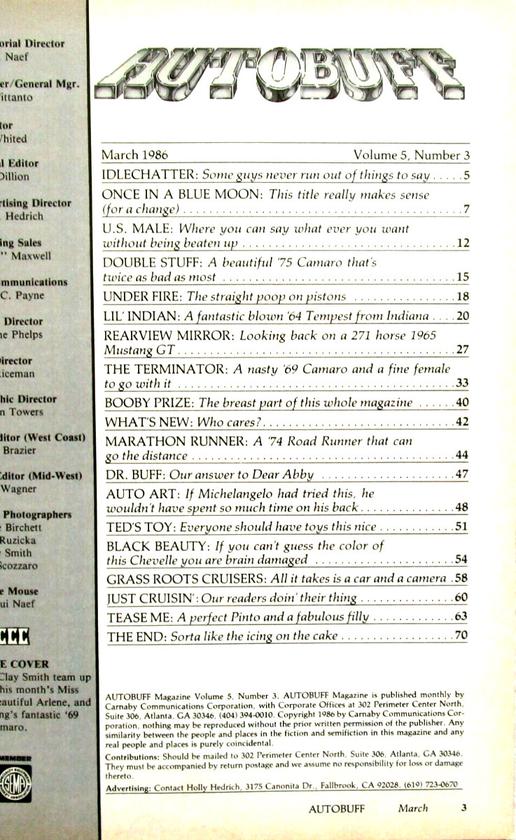 The title was a curious choice for a name. In modern times, "buff" has lost a meaning -- a devotee to a subject or activity. The phrase "auto buff" was a common but now is an old term describing the target market of the automobile publishing industry. But of several other current meanings, the term still means naked. So the authors chose a somewhat clever use of both meanings.