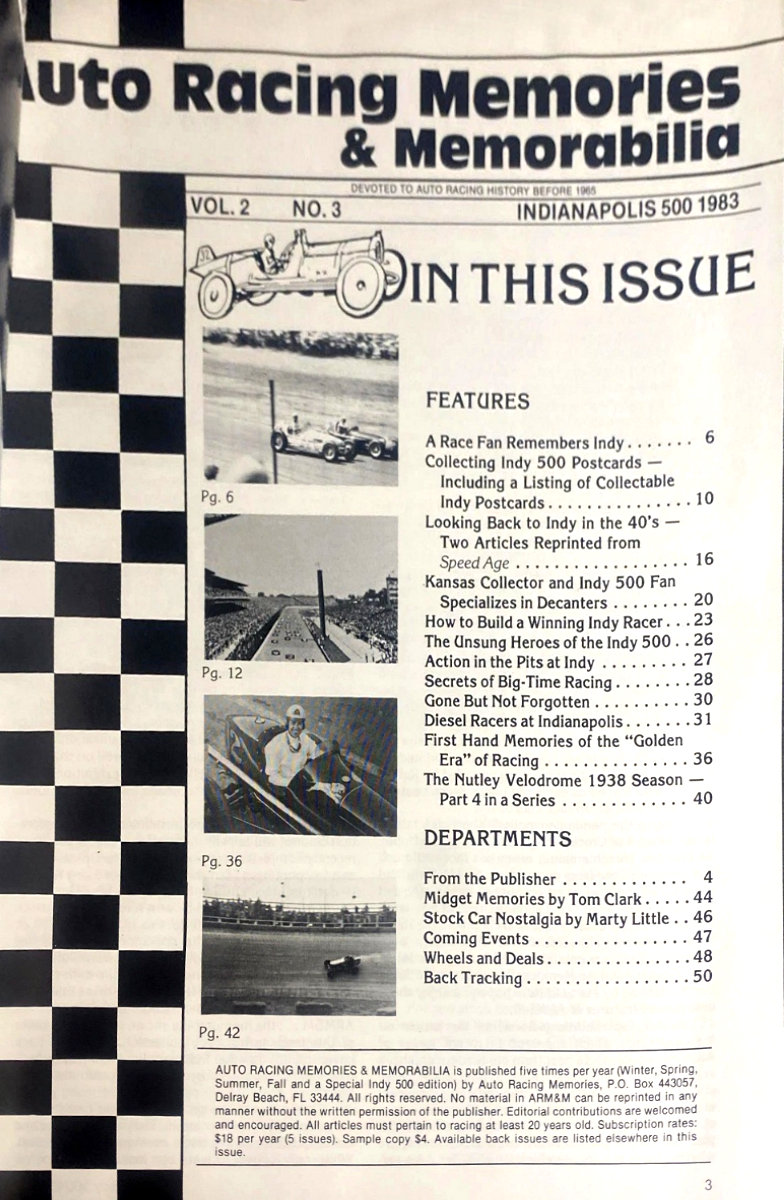 Auto Racing Memories was published by Ken C. Breslauer in Delray Beach, Florida. The magazine was a quarterly title devoted to