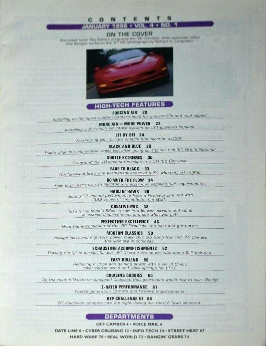 All the titles of CSK Publishing were sold to a division of Primedia, McMullen-Argus. Many magazines were being consolidated under two major players - Primedia and the former Petersen Publishing empire which had become EMAP-Petersen. With this consolidation came a situation where each publisher had multiple titles covering the same general content and target readership. Some magazines disappeared, but other publishers chose to focus more carefully. So in September, 1998, HTP was re-titled to GM High Tech Performance (GMHTP) and shifted content to cars from General Motors.