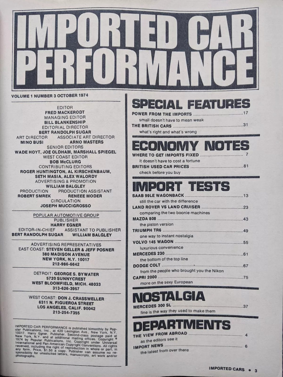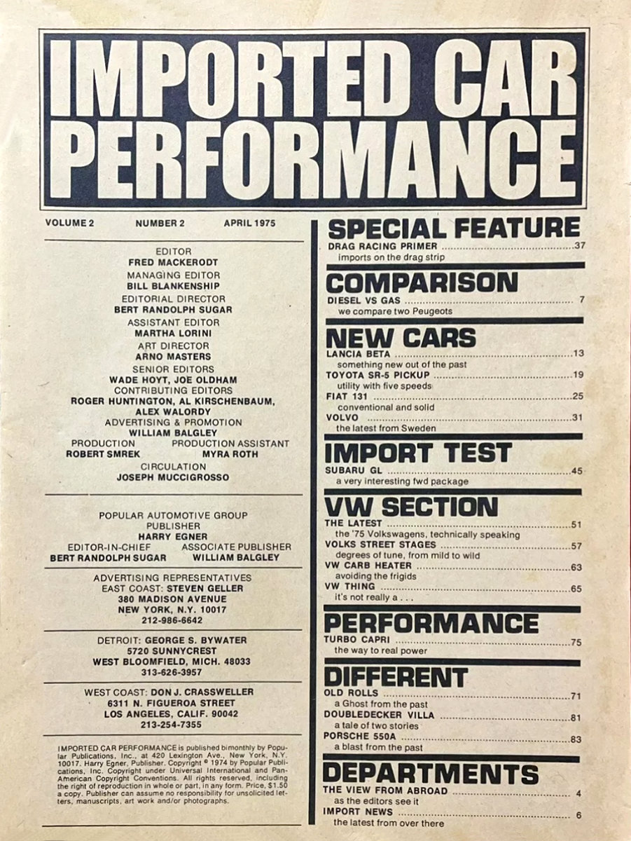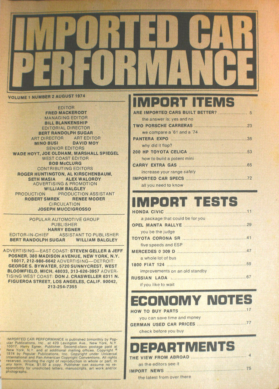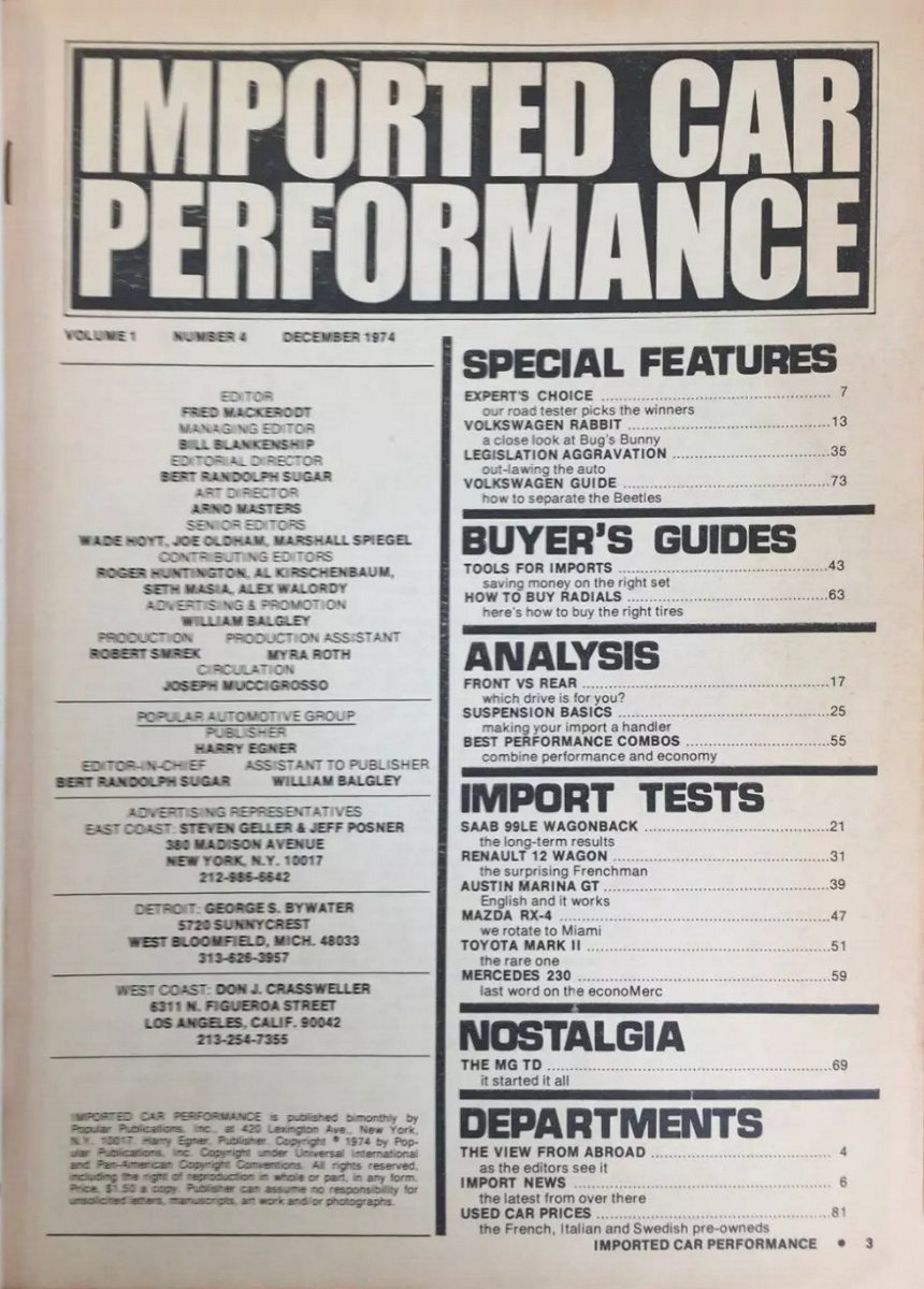This one, Imported Car Performance, was published by Harry Egner and his Popular Publications organization. The editor was Fred Mackerodt, and content covered new car reviews, buying tips, and general topics of imported car interest.