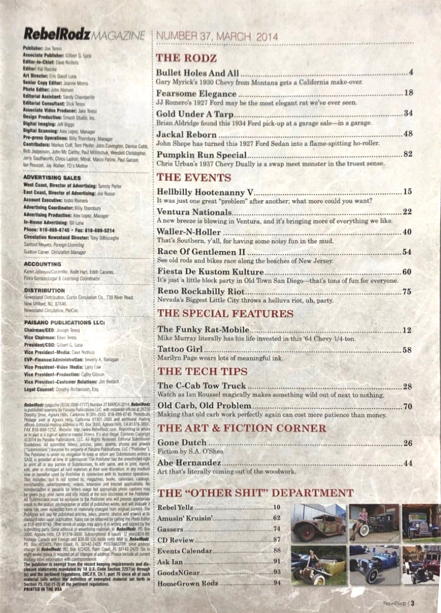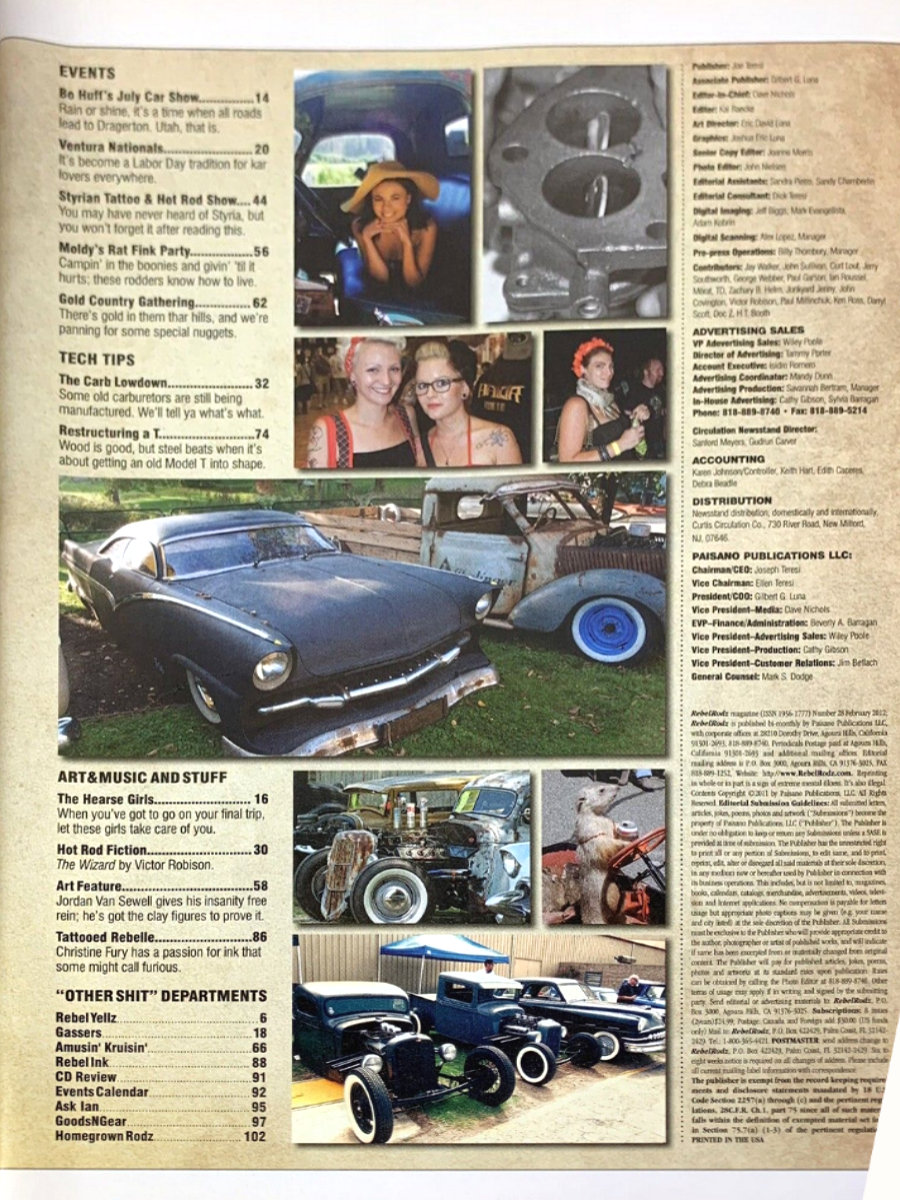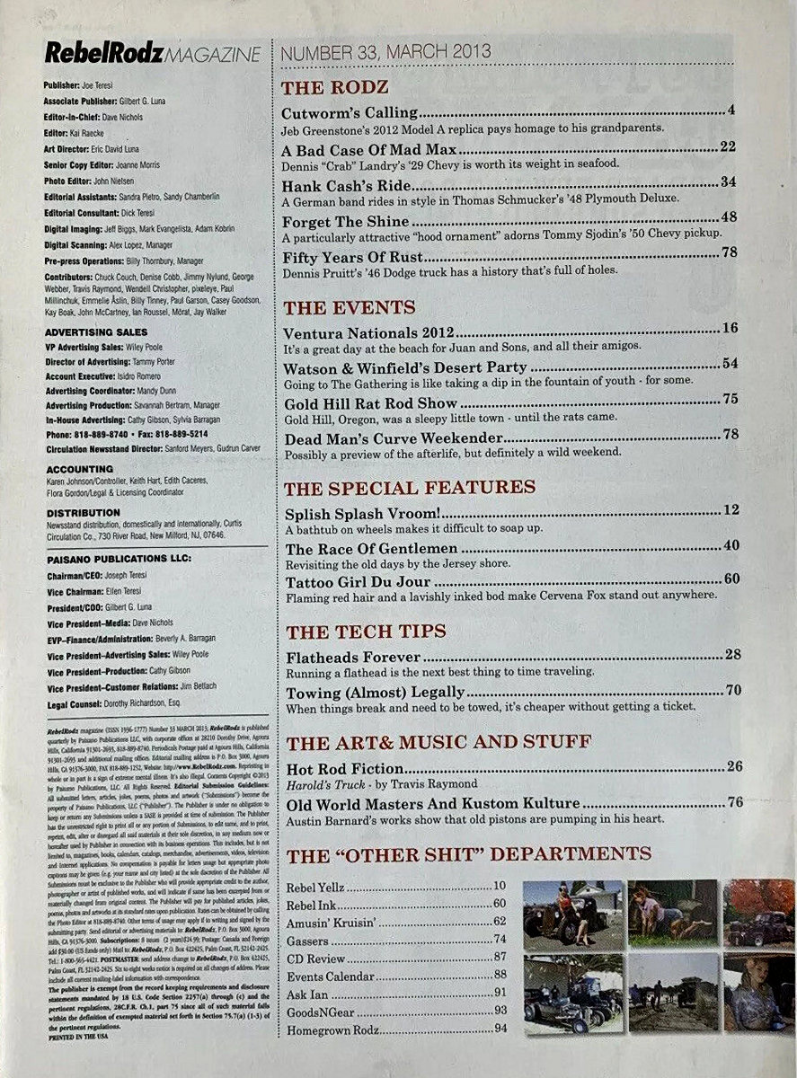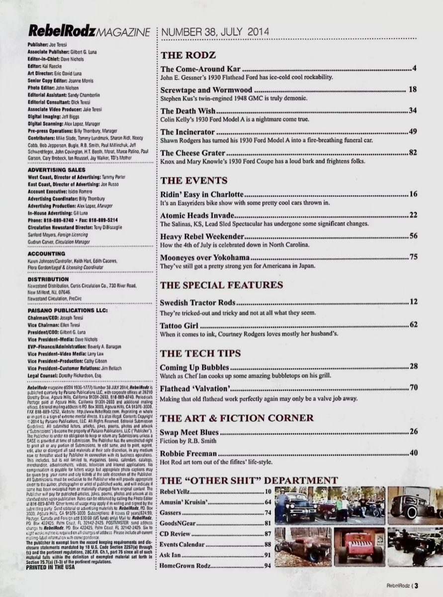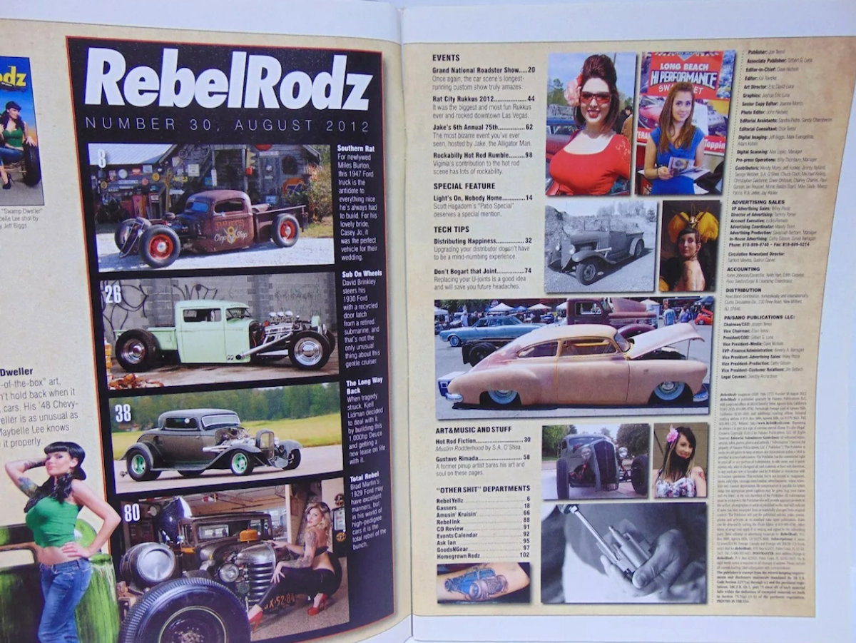 Rebel Rodz had a regular print cadence through 2012 as a bi-monthly title, then became more of a quarterly magazine in 2013 and 2014. The last year appears to have been 2015 when the print cadence slowed, the publisher issued two "book-a-zines" with 100 plus pages of rods and "betties", and the publisher offered a "double-pack" where Rebel Rodz was provided with a subscription of Tattoo magazine. Clearly the end of print publication was near.