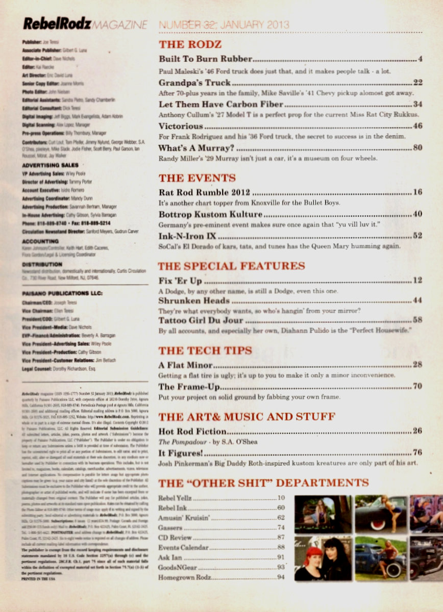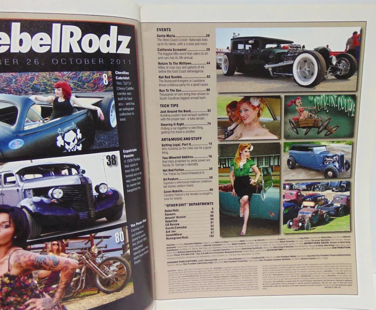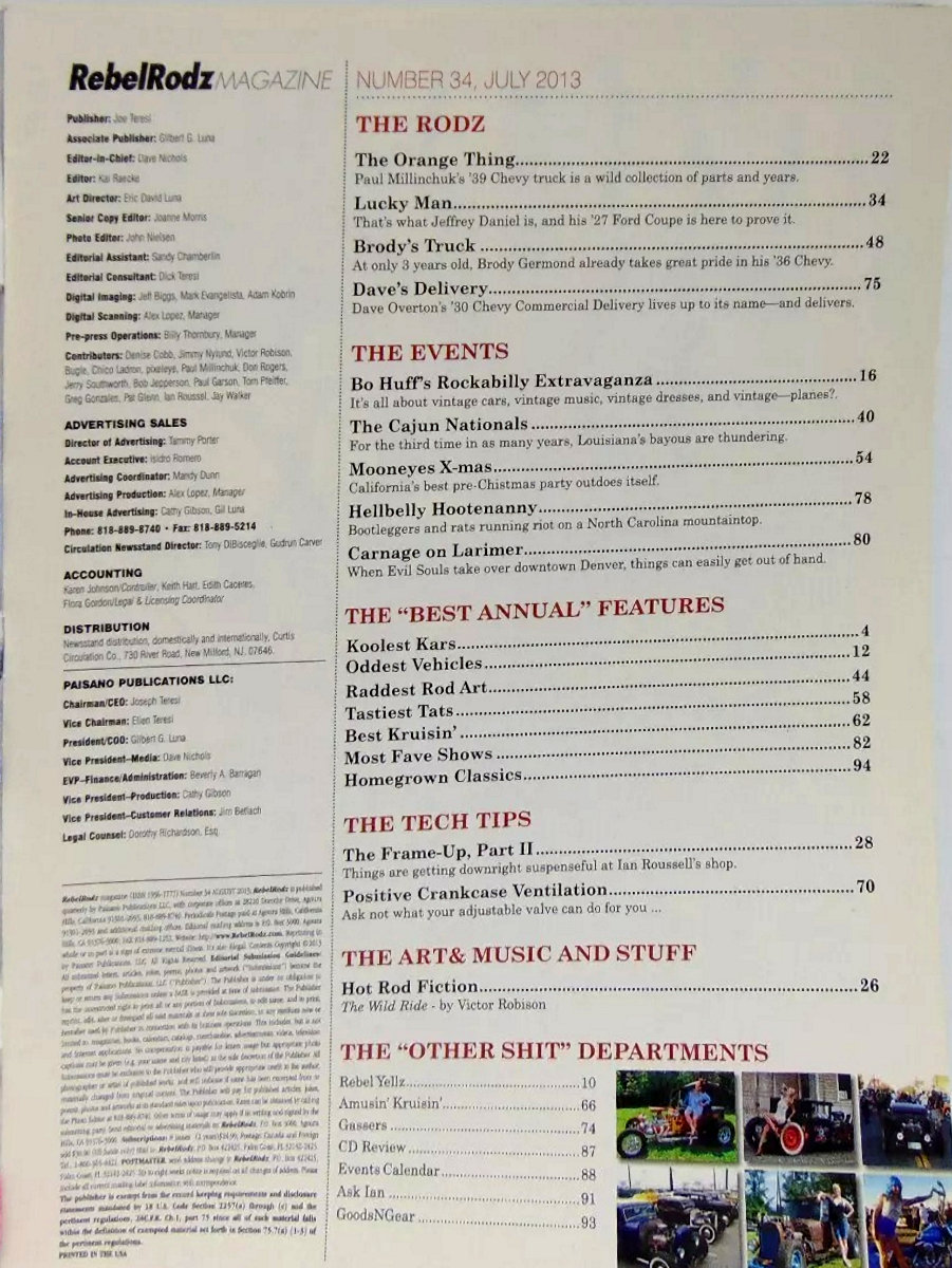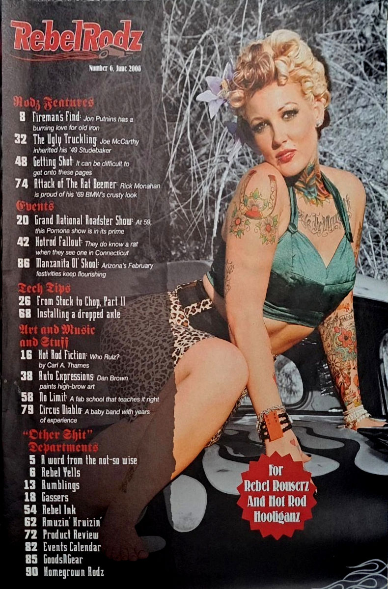 Rebel Rodz had a regular print cadence through 2012 as a bi-monthly title, then became more of a quarterly magazine in 2013 and 2014. The last year appears to have been 2015 when the print cadence slowed, the publisher issued two "book-a-zines" with 100 plus pages of rods and "betties", and the publisher offered a "double-pack" where Rebel Rodz was provided with a subscription of Tattoo magazine. Clearly the end of print publication was near.