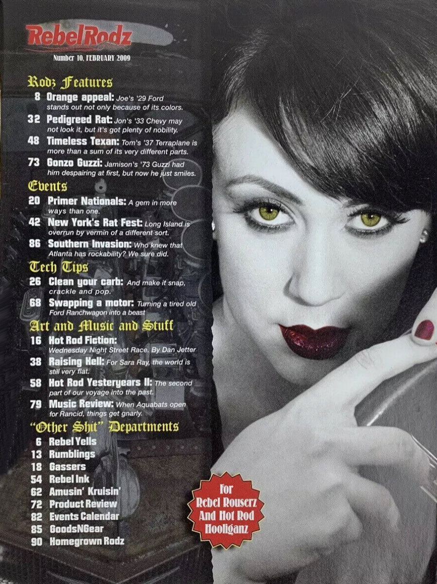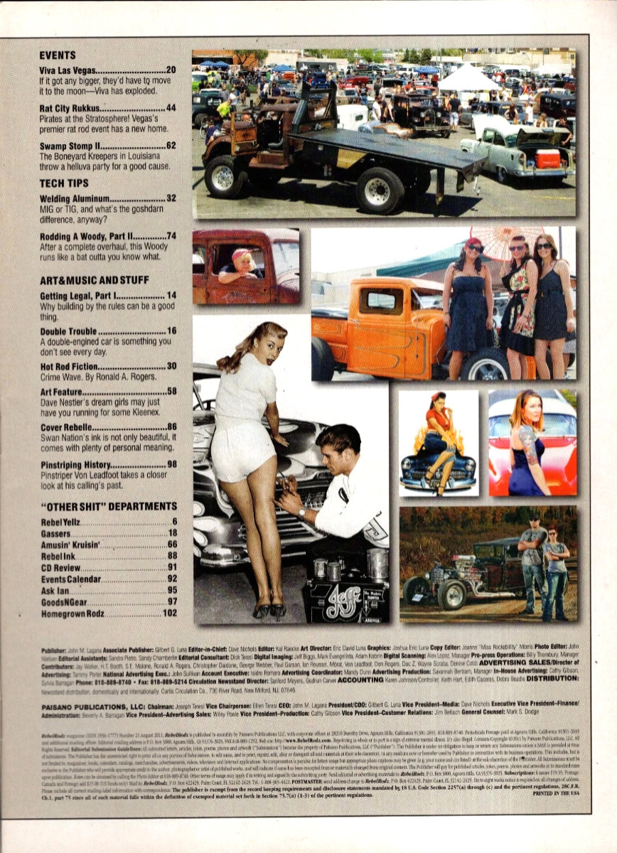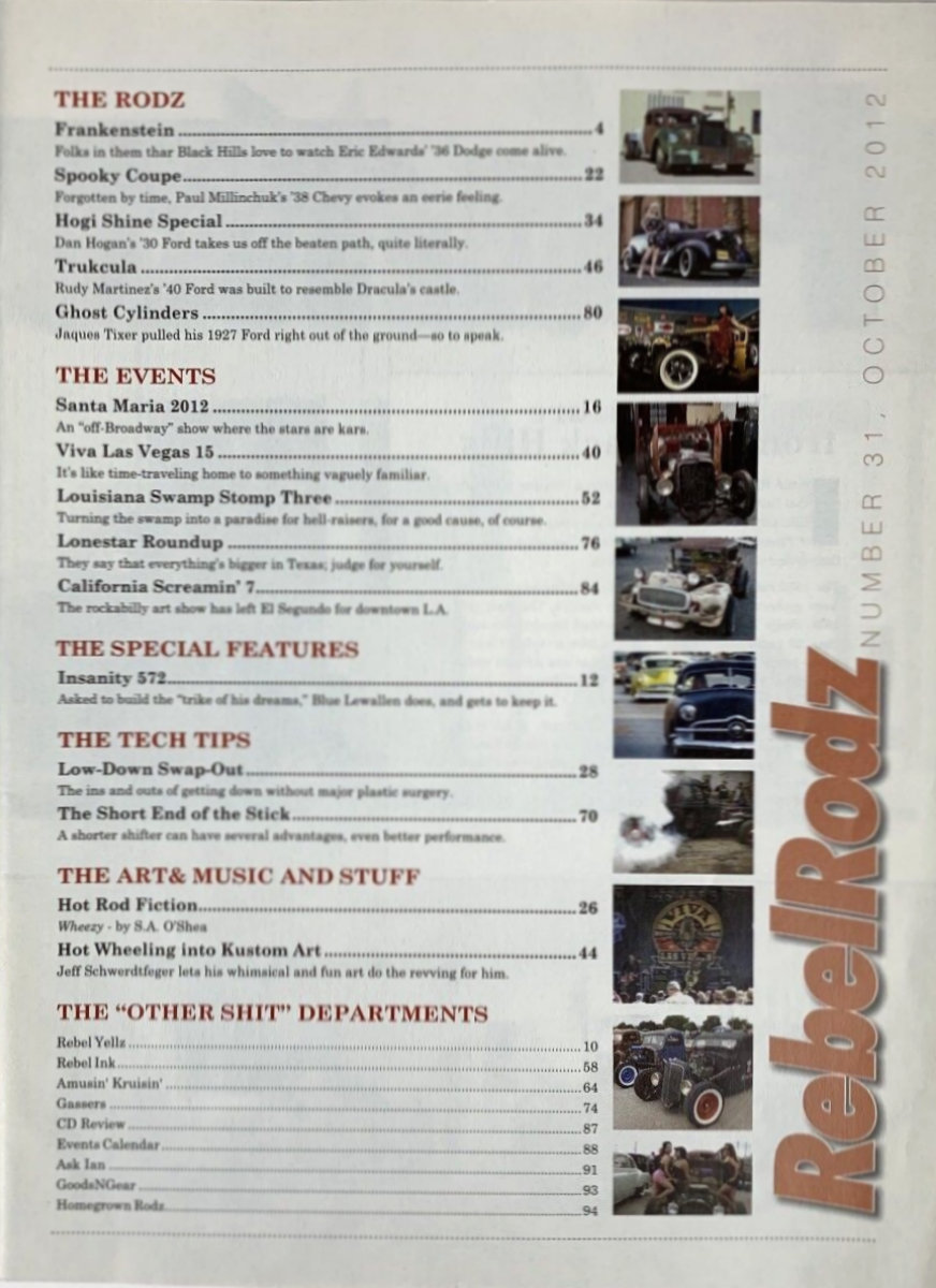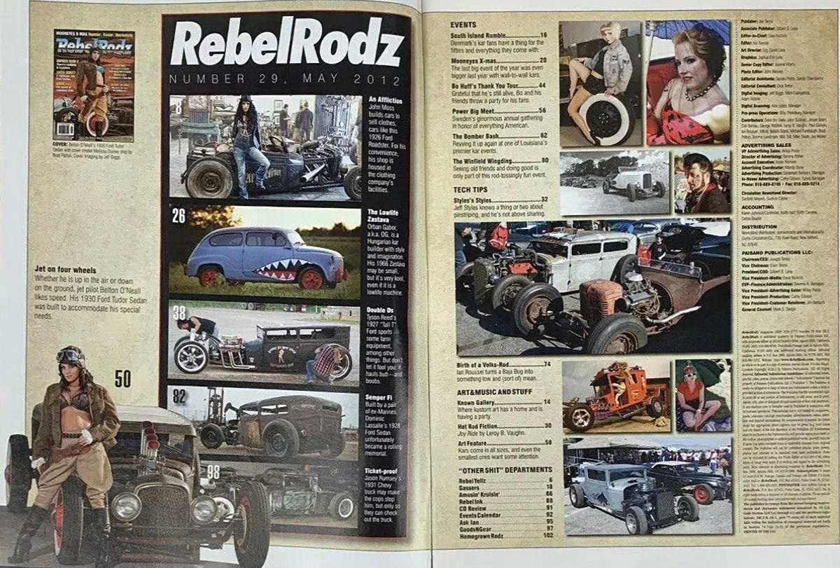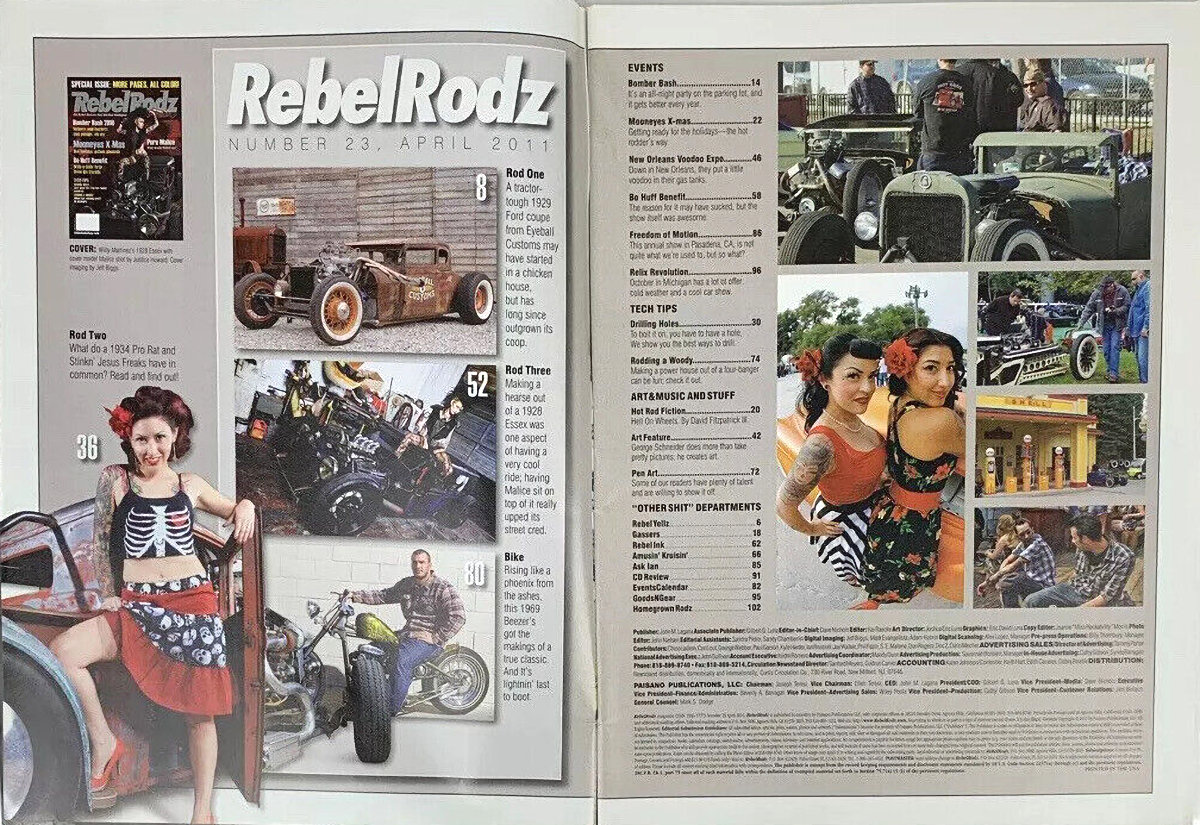 Rebel Rodz had a regular print cadence through 2012 as a bi-monthly title, then became more of a quarterly magazine in 2013 and 2014. The last year appears to have been 2015 when the print cadence slowed, the publisher issued two "book-a-zines" with 100 plus pages of rods and "betties", and the publisher offered a "double-pack" where Rebel Rodz was provided with a subscription of Tattoo magazine. Clearly the end of print publication was near.
